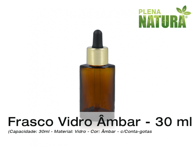Frasco de Vidro Ambar, c/Tampa Conta-gotas em Aluminio Dourado – 30ml